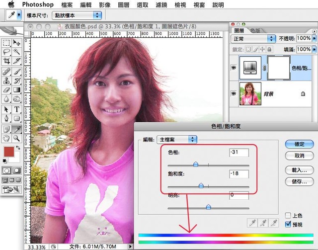 2.如圖示在色相/飽和度做調整,色相的調整依據為下方第一個色條顏色,或是你可以在色相上左右拉動一下,調到理想的顏色。