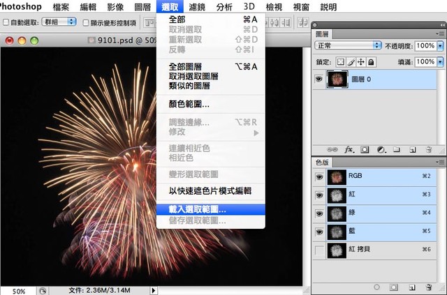 6.回到圖層0,進入選單->選取->載入選取範圍...