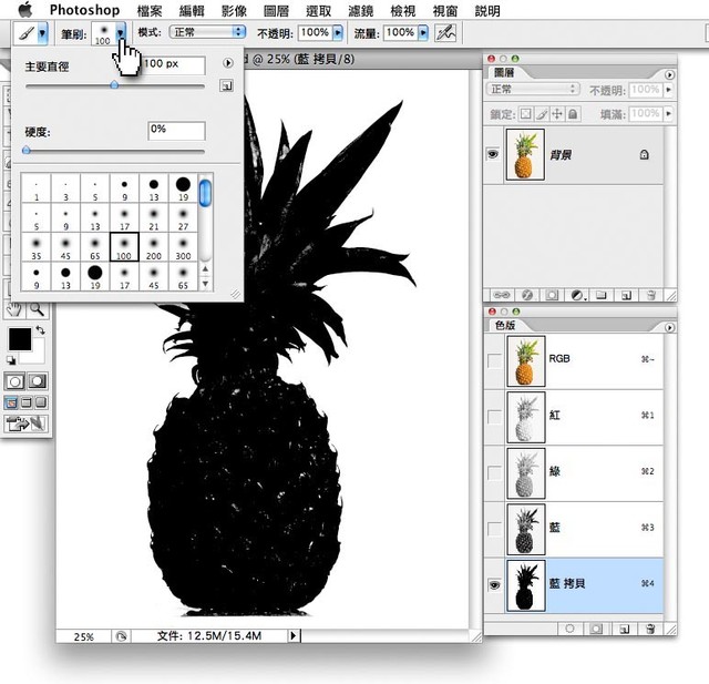 5.調整完對比後,你會發現物件中間還有些許的白,我們必須用筆刷工具把白的部份塗黑。